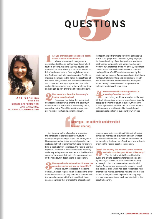 En la primera semana de agosto, Nicaragua estuvo presente en la revista Canadian Travel Press, espacio de gran importancia en el mercado canadiense.