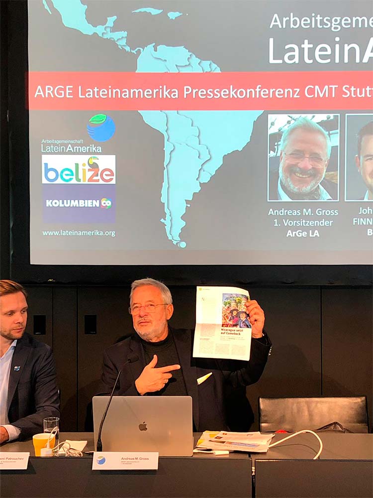 Nicaragua se encuentra representada por ARGE Lateinamerika, el presidente de esta asociación alemana, Andrea Gross, brindó una conferencia de prensa en la que destacó el positivo desarrollo del turismo en Nicaragua.