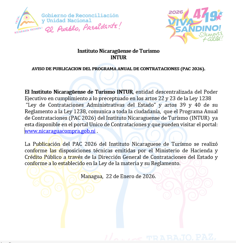 El Instituto Nicaragüense de Turismo hace de su conocimiento información importante a oferentes interesados en participar de las siguientes licitaciones: